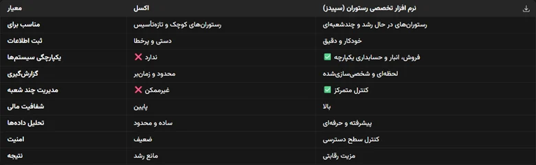 جدول مقایسهی اکسل با نرم افزار تخصصی رستوران (سپیدز)